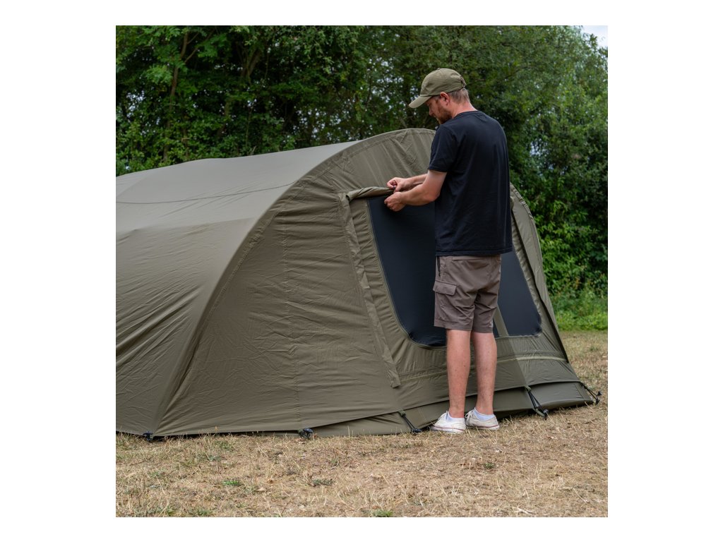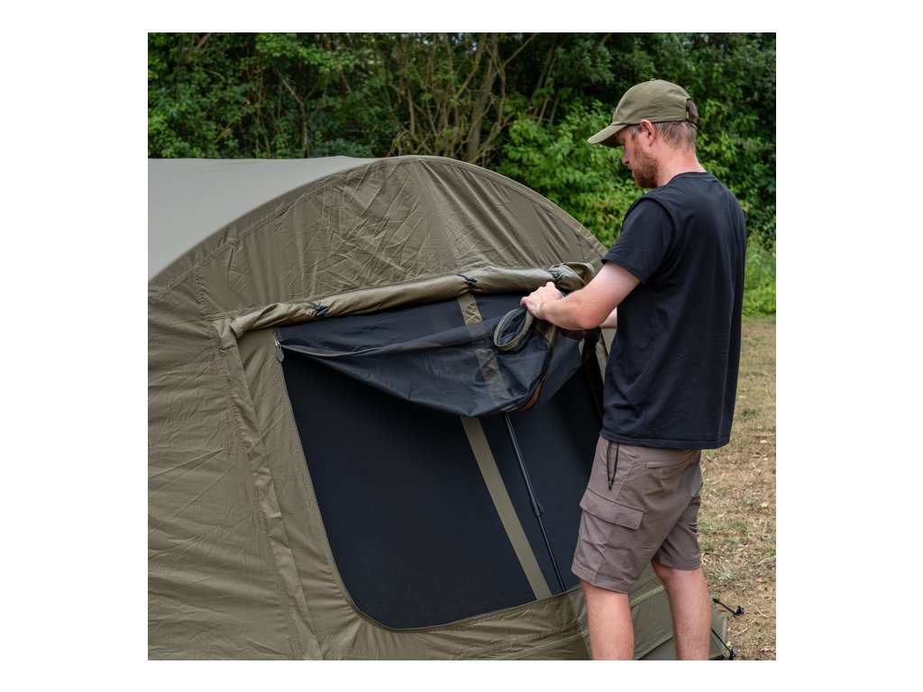 - Přední část přehozu lze vyrolovat a vytvořit tak otevřený bivak. Dveře s několika dvoucestnými zipy pro možnou individuální konfiguraci
