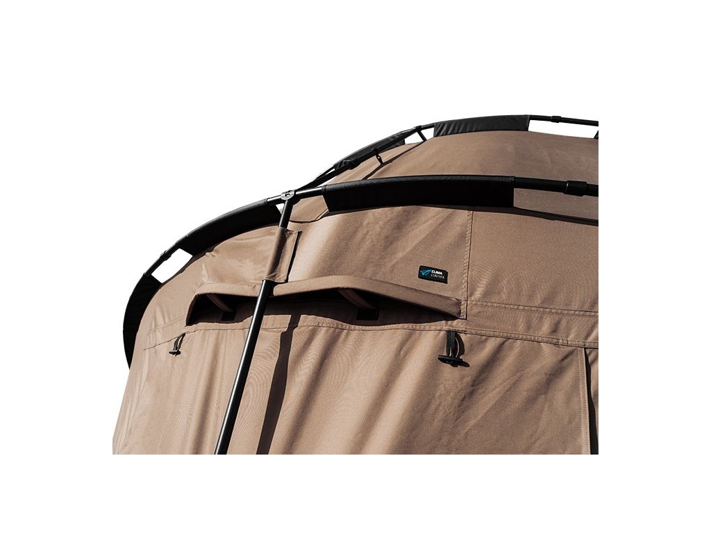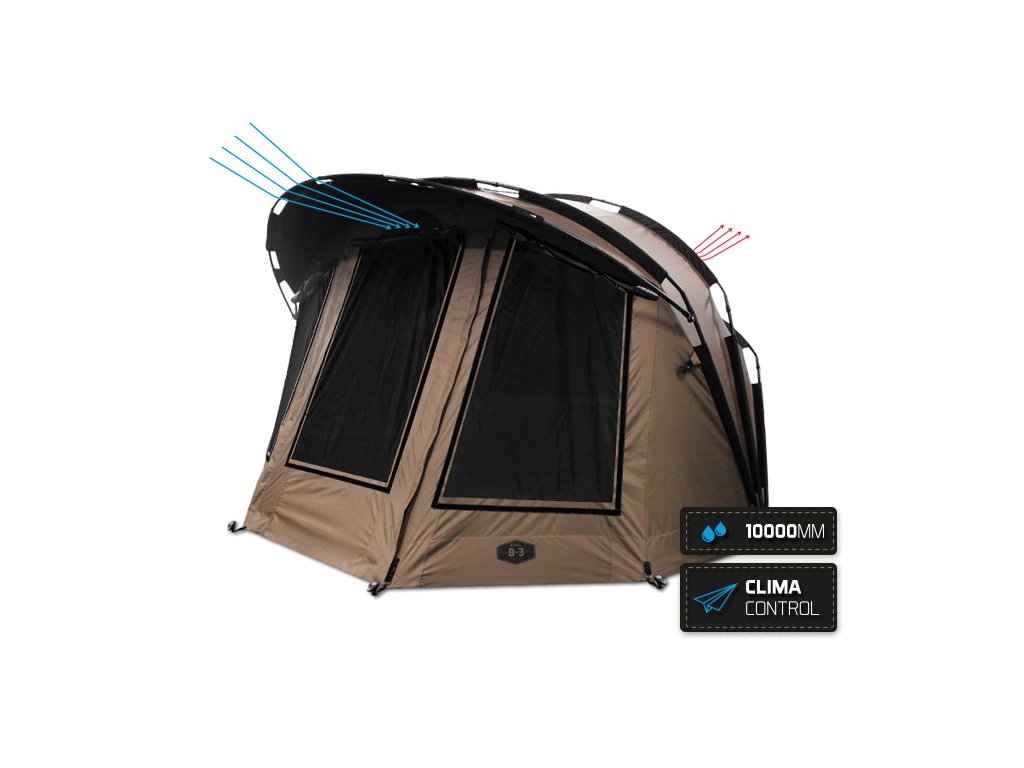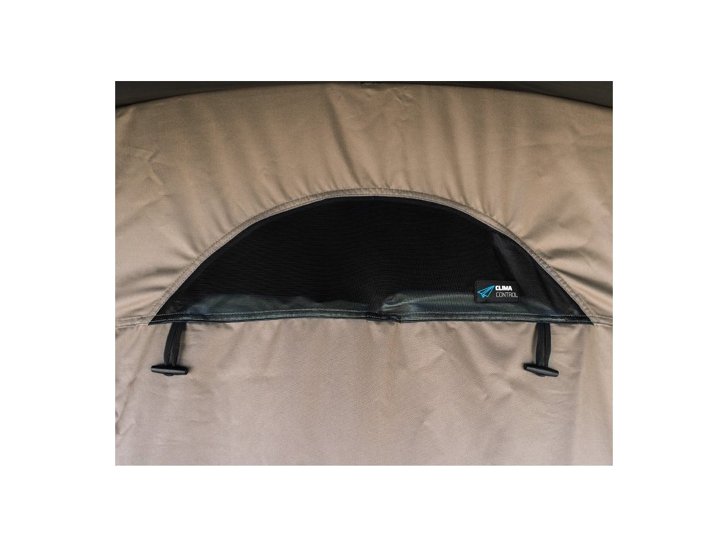 To nejdůležitější na konec. Bivak Delphin B-3 disponuje inovativním systémem CLIMA CONTROL, který byl navržený též designérským oddělením značky Delphin. Tento systém je tvořen dvěma větráky na protilehlých stranách (nad vstupními dveřmi a nad zadním oknem). Díky tomuto důmyslnému systému je možné zabezpečit přívod čerstvého vzduchu a odvod použitého v době, kdy není možné větrat bivak pomocí velkých oken. Určitě ho oceníte zejména v noci, kdy výrazně napomáhá snižovat rosení uvnitř bivaku. Celý systém je navíc jednoduše ovladatelný z vnitřku bivaku.
