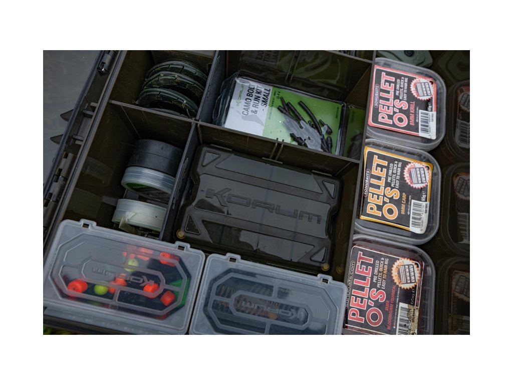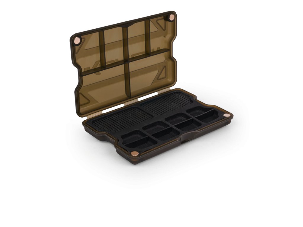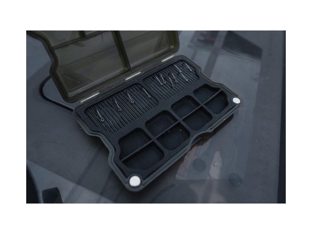 Každý háček lze umístit do měkkých silikonových slotů, kde je pevně držen na místě. Spodní část boxu je ideální pro předbroušené háčky, háčkové návazce a další předvázané návazce.