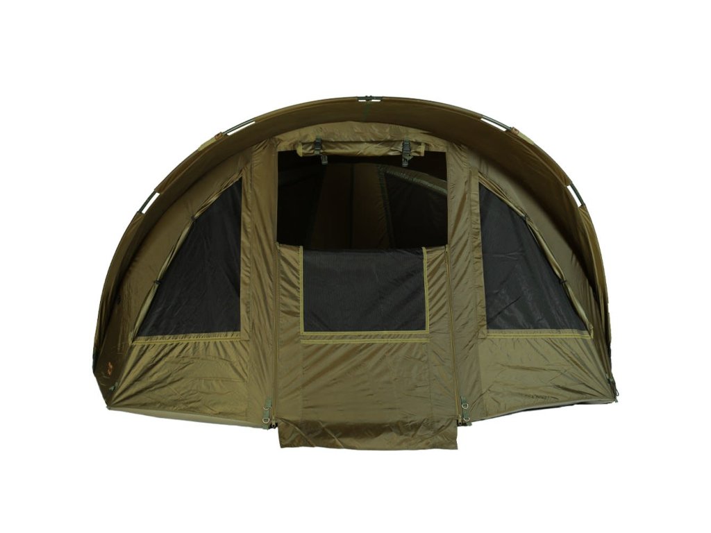 Přístřešek trubkové konstrukce, která se skládá ze tří žeber a o výztuhu se starají rozpěrné teleskopické tyče. Na tento bivak, byl použit vodě odolný materiál 5 000mm HH, té nejvyšší kvality, který je 100% nepromokavý a máme ho prověřený u řady našich úspěšných modelů. Páskou podlepené švy a ukotvení na zavrtávací kolíky, které jsou v ceně přístřešku. Bivak je vybaven větracím systémem jak v přední části, tak v zadní části najdete dvě obří ventilační okna, které zajistí maximální odvětrání. Velký přední kšilt nad vchodem, je navíc osazen dvěma praktickými úchyty na pruty. Přední vchodová část má tři výměnné panely na suchý zip, celo zakrytá, slída nebo moskytiéra. Další vychytávkou tohoto bivaku je, že v nepřízni počasí můžete ve vchodové části vytvořit okénko, díky použití dvojitých jezdců zipu. Součástí bivaku je přepravní nylonová taška.