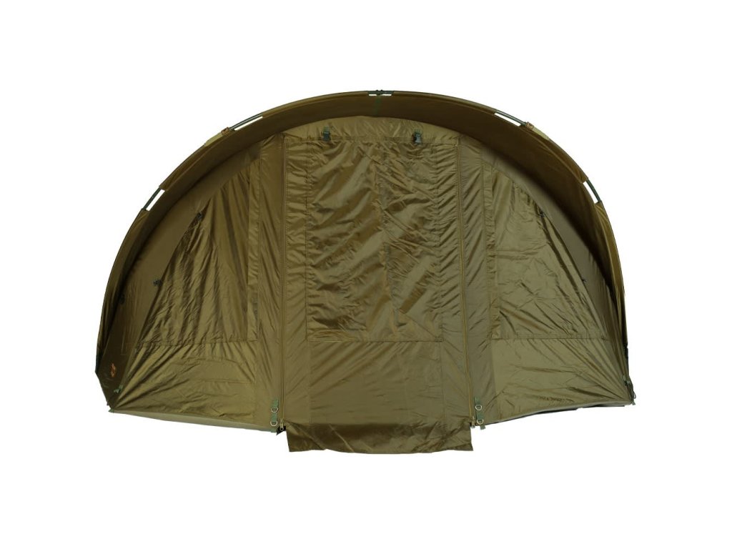 Přístřešek trubkové konstrukce, která se skládá ze tří žeber a o výztuhu se starají rozpěrné tyče. Na tento bivak, byl použit vysoce kvalitní vodě odolný materiál 10 000mm HH, který je 100% nepromokavý. Páskou podlepené švy a ukotvení na zavrtávací kolíky, které jsou v ceně přístřešku. Bivak je vybaven vylepšeným větracím systémem, které zajišťují dvě přední okna, tak tři velká v zadní části, které zajistí maximální odvětrání. Velký přední kšilt nad vchodem, je navíc osazen dvěma praktickými úchyty na pruty. Přední vchodová část má tři výměnné panely na suchý zip, celo zakrytá, slída nebo moskytiéra. Další vychytávkou tohoto bivaku je, že v nepřízni počasí můžete ve vchodové části vytvořit okénko, díky použití dvojitých jezdců zipu. Další praktická věc, celí přední panel lze odepnout pomocí zipu a máte otevřený přístřešek. Přístřešek je dodáván s kvalitní pogumovanou podlážkou, která se k bivaku připne pomocí klasického zipu, díky tomu Vám do bivaku nevleze hmyz a nezateče voda. Pro lepší a snadnou orientaci osazení podlážky do bivaku, jsme nechali našít 3D označení vstupu. Součástí bivaku je přepravní nylonová taška.