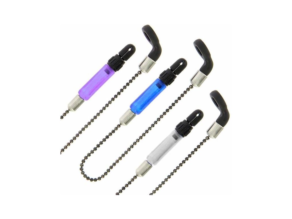 Sada tří jednoduchých řetízkových swingerů NGT se spolehlivým uchycením vlasce pomocí plastové svorky, u které lze snadno pootočením nastavit odpor upnutí. V sadě je modrý, bílý a fialový swinger.