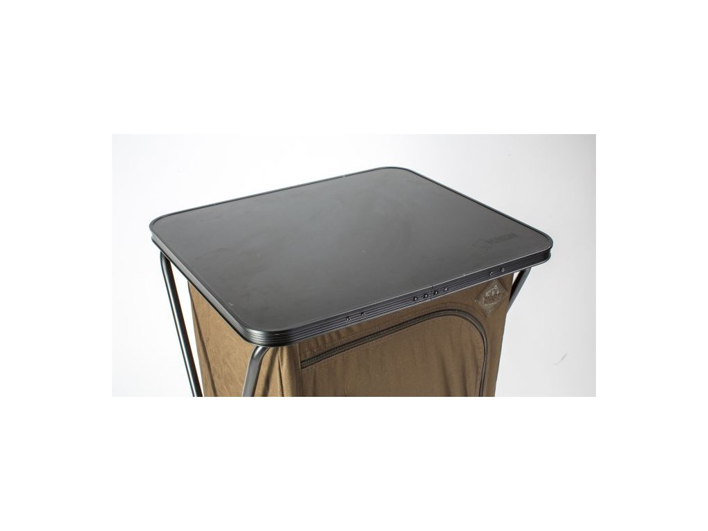 Odkládací prostor na celou výpravu, který se dá složit naplocho. Bank Life Storage Unit je skládací jednotka se třemi sekcemi a pevným pracovním stolkem na vrchní straně. Vyrobeno z odolného snadno omyvatelného nylonu. Přepážky jsou vyztužené a snadno se zasouvají dovnitř. Rám ve tvaru X je velmi stabilní, ale ve vteřině ho můžete snadno složit do příslušné transportní tašky. Je to ideální partner pro dlouhé vycházky. Nabízí odkládací prostor hned po ruce a zároveň pracovní desku. Na stolku je vytištěno logo Nash. Okna k odkládacím prostorám se dají uchytit pomocí smyček, abyste se o obsahu snáze dostali.