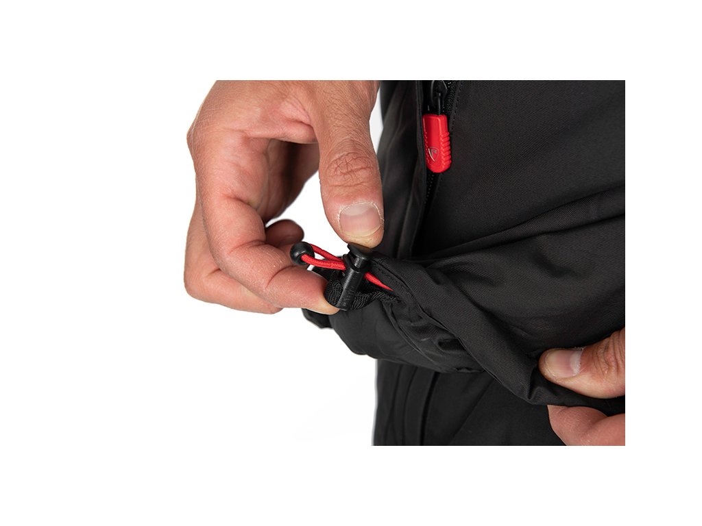 - Spodní strana nohavic opatřená na zip uzavíratelným rozšířením pro holínky, s dobře uchopitelnými táhly pro utažení kolem kotníků