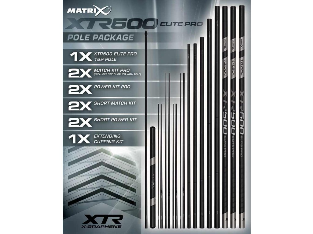 - Balíček XTR500 Elite Pro 16m Dělička 16m XTR500 Elite Pro 2ks Pro match topsetů (včetně 1ks v děličce) 2ks Pro power topsetů 2ks Short match topsetů 2ks Short power topsetů 1ks Twist lock prodlužovací kalíškovací topset Sada kalíšků 1x Mini mini prodloužení (do dílu 13m, 14,5m a 16m) Obal Duralite XTR500 Elite Pro 16m Pole Package 16m XTR500 Elite Pro Pole 2x Pro match kits (includes one supplied in the pole) 2x Pro power kits 2x Short match kits 2x Short power kits 1x Twist lock extending cupping kit Groundbait cup set 1x Mini extension (fits 13m, 14.5m & 16m) Duralite pole case.