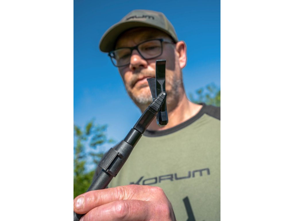 Podpěra se může volně otáčet do svislé polohy, ale po zasunutí prutu se přizpůsobí. Pro dosažení nejlepších výsledků používejte s vidličkami.