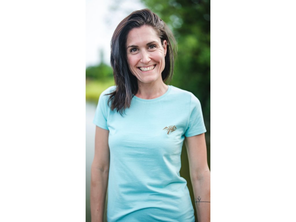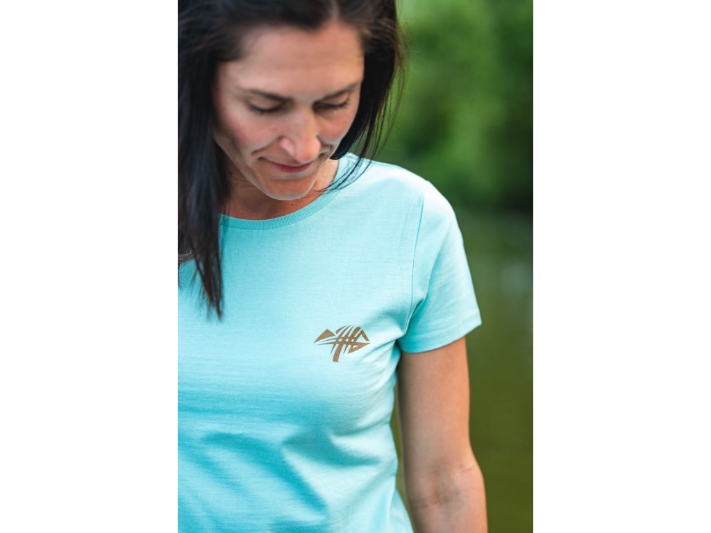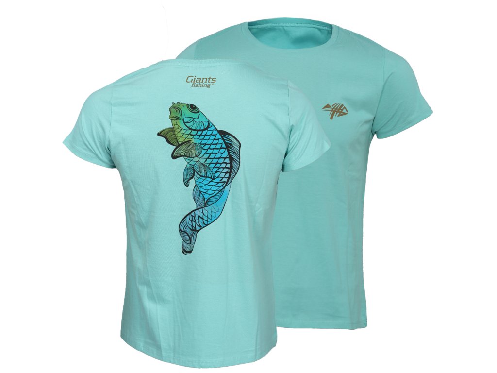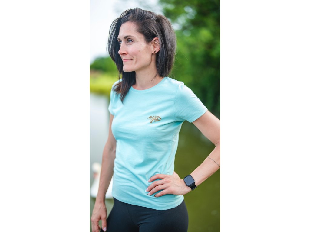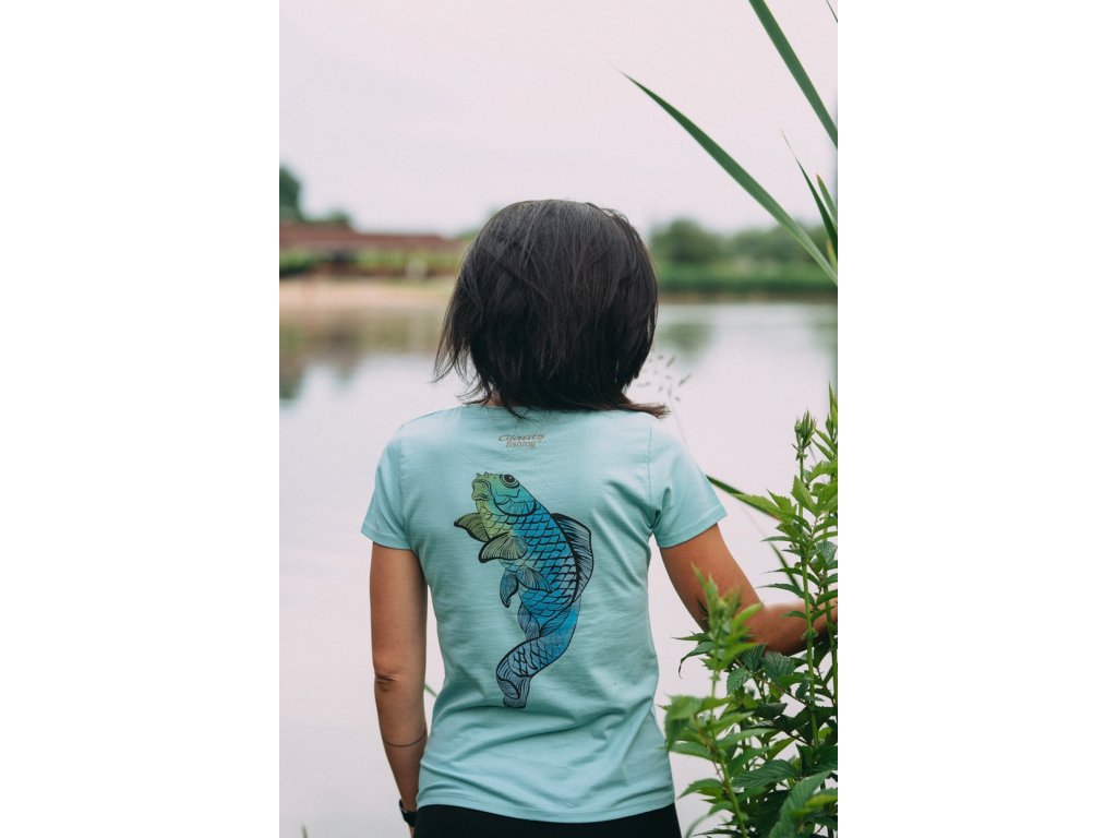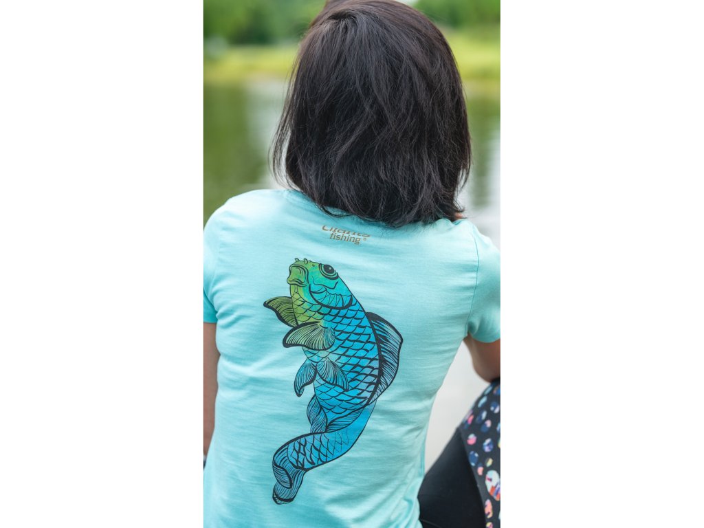 Kvalitní dámské tričko v zelené pastelové barvě s designem koi kapra na zádech.