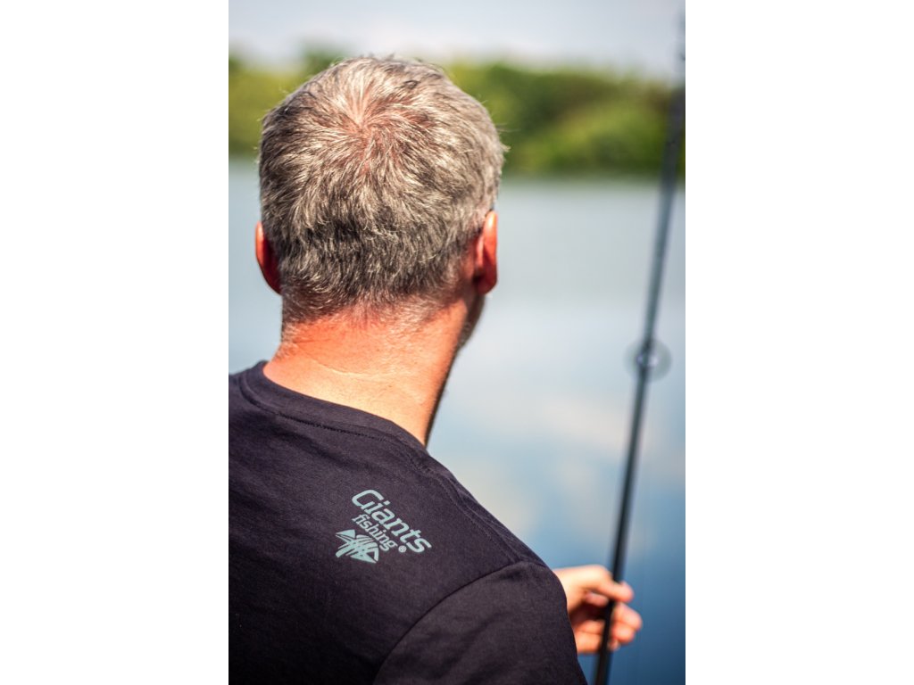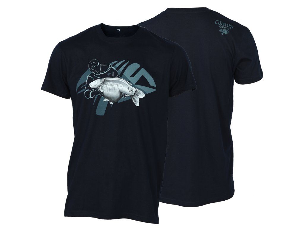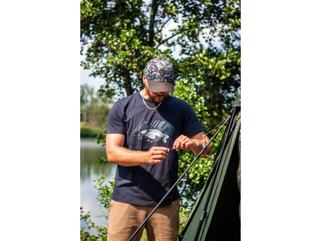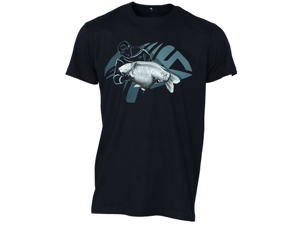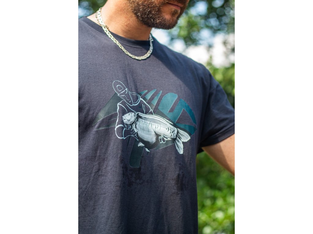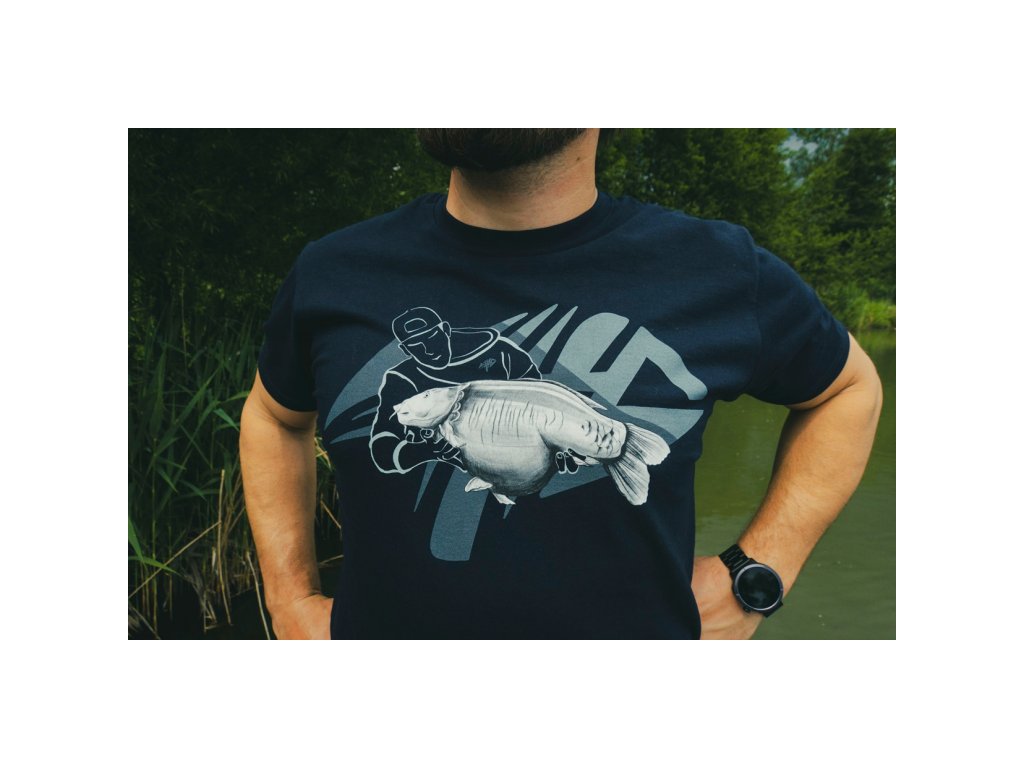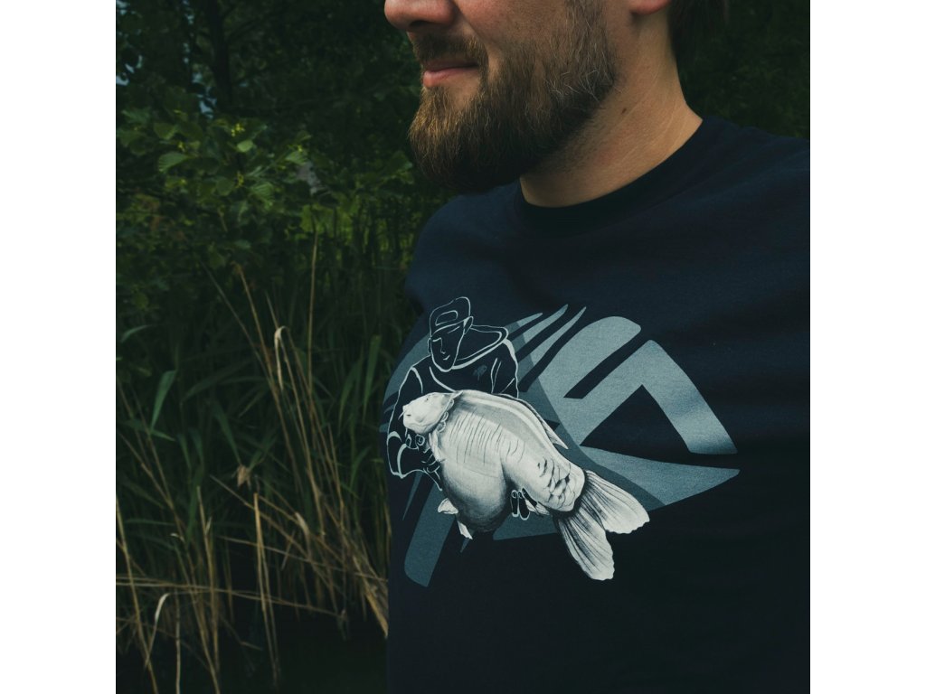 Kvalitní tričko v tmavě modré barvě s designem rybář s úlovkem kapra.