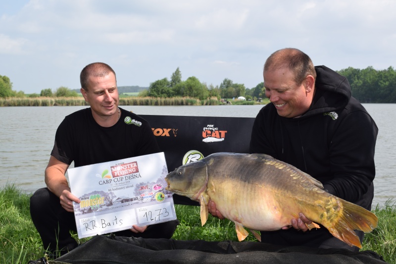 Ahoj Radku. Od 17.5 do 20.5.2018 jsme se s týmovým kolegou Romanem Bařinou zúčastnili III. ročníku Monster Fishing Carp Cup Dešná. Po problémech které nastali při losování lovného místa jsme si na podruhé vylosovali lovné místo č.25. Po zevrubném prostudování jsme zjistili že místo je nic moc ale že se s tím nějak popereme jsme zahájili závod chycením asi 4 nebodovaných ryb. Bodovat jsme začali až v druhý den závodu a to hned krásným lyscem chyceným na boilies MARINE JOKER o hmotnosti 12,73 kg. Tato ryba nás povzbudila a v ten den se nám podařili ještě dvě bodované ryby o hmotnosti 9,01 a 10,61 kg. Jenže to bylo na dlouho všechno. Jelikož jsme potřebovali zapsat ještě aspoň dvě bodované ryby tak jsme všechno vrhli na jednu kartu a tou byla volba jménem MARINE JOKER. Odměna v podobě další bodované ryby přišla až poslední den a tou byl kapr o hmotnosti 8,34 kg. Tato ryba nás katapultovala na konečné 18 místo z 29 týmů. V příloze ti posílám nějaké fotky. Děkujeme ti za podporu našeho týmu RR BAITS Vlčnov.
