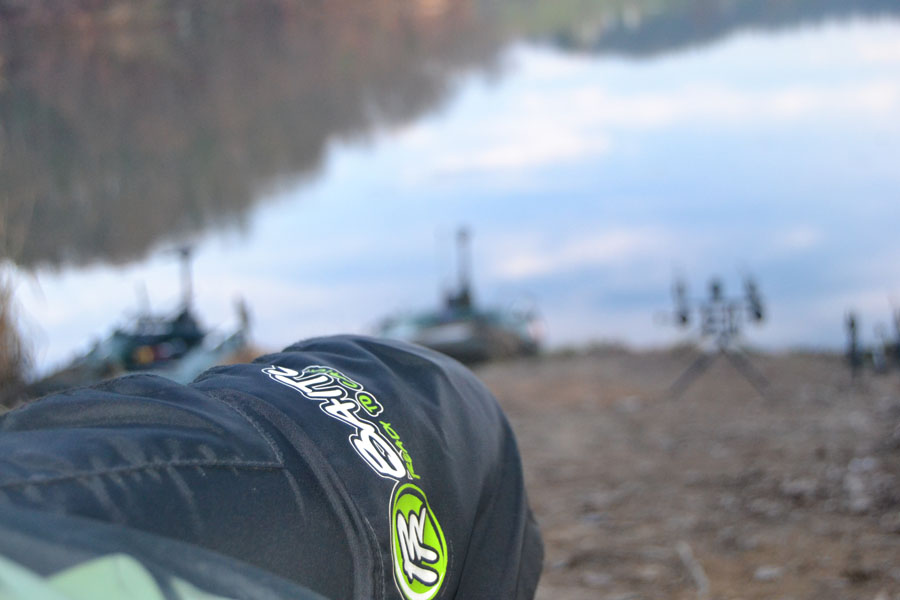 Jako první do vody letěly markerové udice. Hloubky se pohybovaly mezi 5-8 metry. Dno před námi vypadalo relativně čisté. Radek mi dal na výběr, ať si zvolím stranu. Vzal jsem hlubší, tedy pravou. Umístili jsme udice, naspombili krmení a stavíme tábor. Přichází za námi místní kaprař, náš kamarád Dominic. Dozvídáme se nemilou zprávu. Za pět dní na jezeře začínají rybářské závody. Startovní listina je již bohužel plná, takže se nemůžeme účastnit. Rozhodli jsme se zůstat a v průběhu vyhodnotíme co dál. Dokončujeme výstavbu tábora a na úspěšný lov plním baňky. První várka směřuje tradičně do vody jako úplatek pro vodníka. Slunce zapadá a mě přichází premiérová jízda na nové Flajzary. Ve vteřině u stojanu. Jakmile ale zvedám prut, kontakt je pryč. Zklamaně smotávám montáž. Kombinovaný návazec upálený chirurgickým řezem přímo nad háčkem. S tím se bohužel nedá moc dělat a silnější materiály nemám v zimním období a při slabé aktivitě kaprů v oblibě. Co je ale důležité – udělali jsme záběr. Z penálu beru připravenou montáž a měním na gizmo obratlíku. Zajistím antitanglem a sestava letí zpět k ostrovu. První noci se další aktivity nedočkáme.