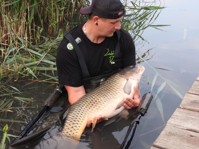 V sobotu kolem 5 ráno mě probouzí krátké pípání,nazouvám prsačky a jdu pro prut do vody,než dojdu k prutu záběr přechází do „padáku“.Pomalu dotáčím vlasec a přisekávám.A je to tam … sedám do člunu a jedu si pro něj.Po krátkém přetahování dostávám do podběráku krásného bojovníka o váze 13,3 kg. Přišel dva dny po zavezení a zabral na 20tku Marine Joker se 14 mm popkou stejné příchuti.Montáž jsem měl položenou u rákosí v 1,7 metru.
